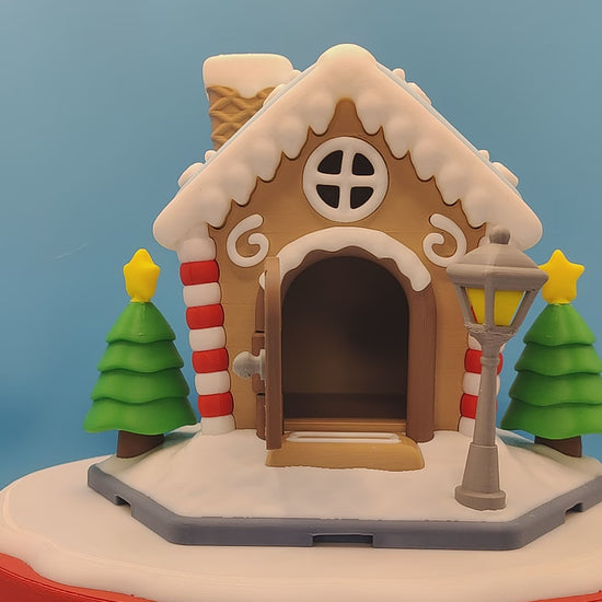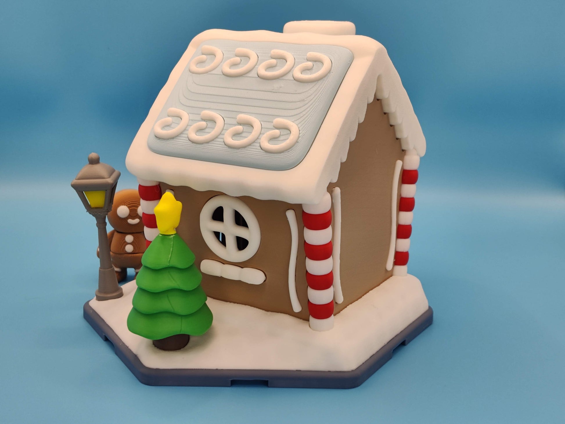 Bring a cozy holiday vibe to your display with this 3D printed gingerbread house. It features clean details, snowy trim, candy cane pillars, bright stars, and a matching gingerbread figure. Each piece is made to order using high quality filament for crisp color and durability. This is a great option for collectors, holiday decorating, tiered trays, desk displays, or gifting.